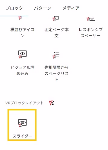 1.Lightning VKブロックレイアウト > スライダー を編集画面に追加します。