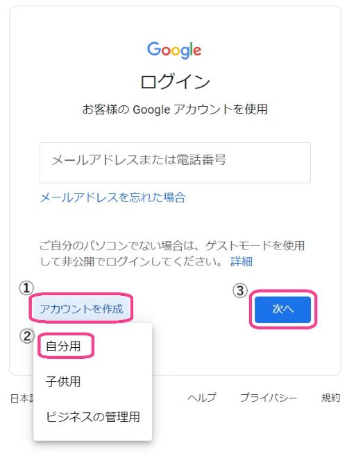 ①[アカウント作成]をクリックし、②[自分用]をクリック、③[次へ]をクリックします。
